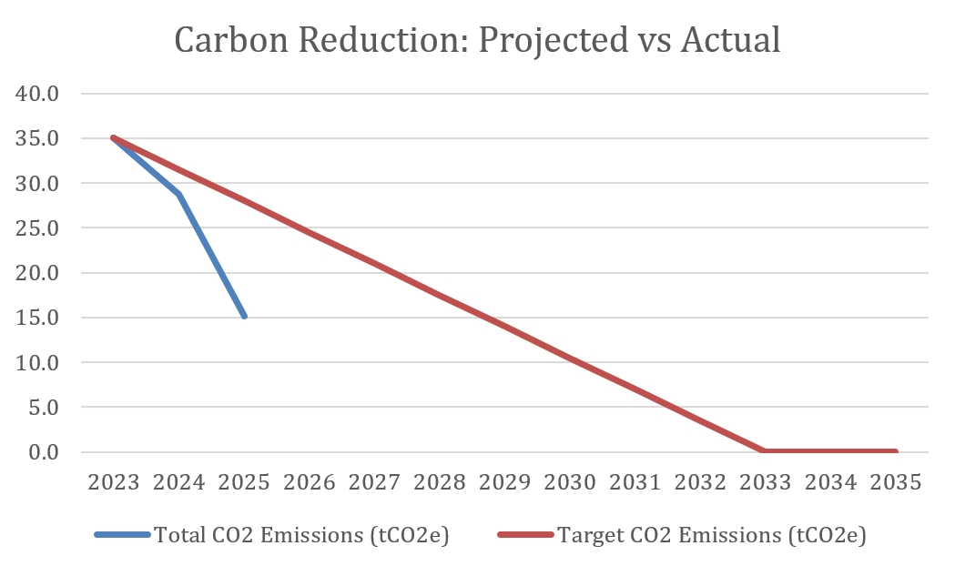The following environmental management measures and projects have been completed or implemented since the 2023 baseline. The carbon emission reduction achieved by these schemes equates to 19.9 tCO2e, an 57%ge reduction against the 2023 baseline and the measures will be in effect for the duration of the contract and beyond.